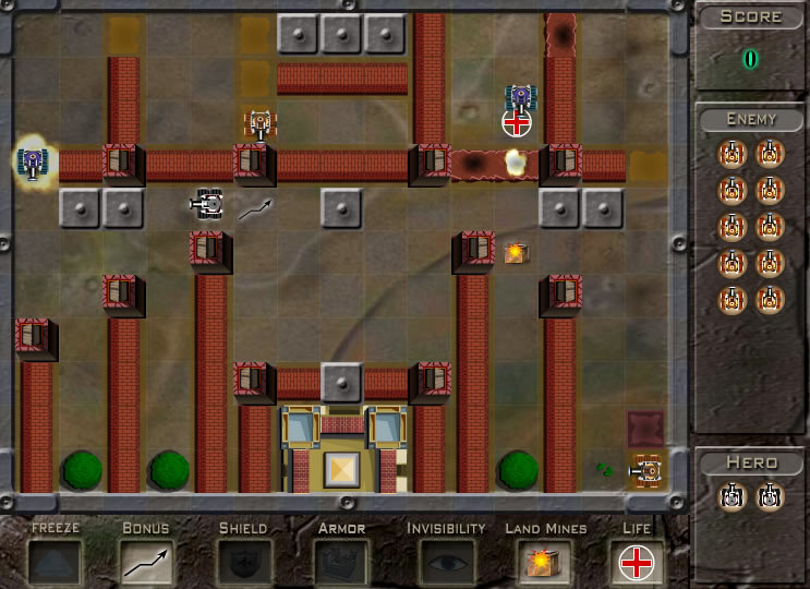 You are in a battle maze surrounded by enemies. Your aim is to protect your base by destroying the enemy tanks. Keep watch over various enemies as you are highly vulnerable to attacks.