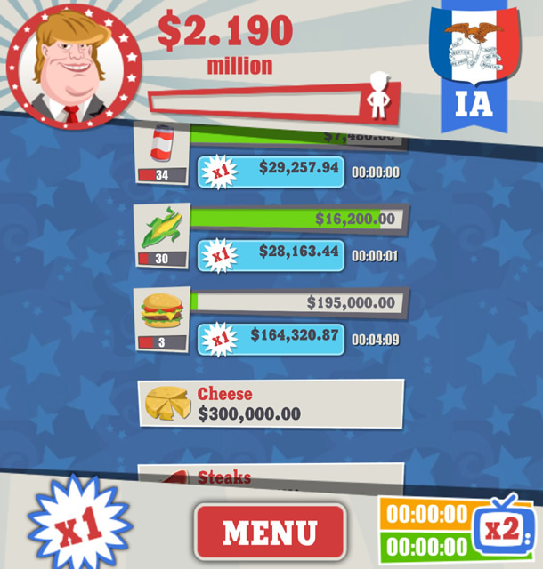 Help the Donald, under guidance of his father Fred, to become the President of the United States of America. Are you gonna be the next US president? That will depend on the way you do your job! Produce food, sell it and hire a manager. Have fun!