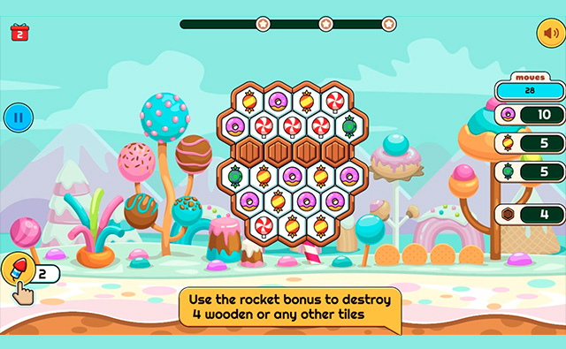 Enter a colorful world of sweet challenges! Your aim is to combine identical candies in groups of two or more to make them disappear and collect the requested sweets. But beware, wooden blocks, honeycombed tablecloths and jam stains will complicate your task. Occasionally, a key appears, and your mission is to guide it to the exit using limited moves. Need a helping hand? Bonuses appear to help you get through the toughest levels. Have fun!