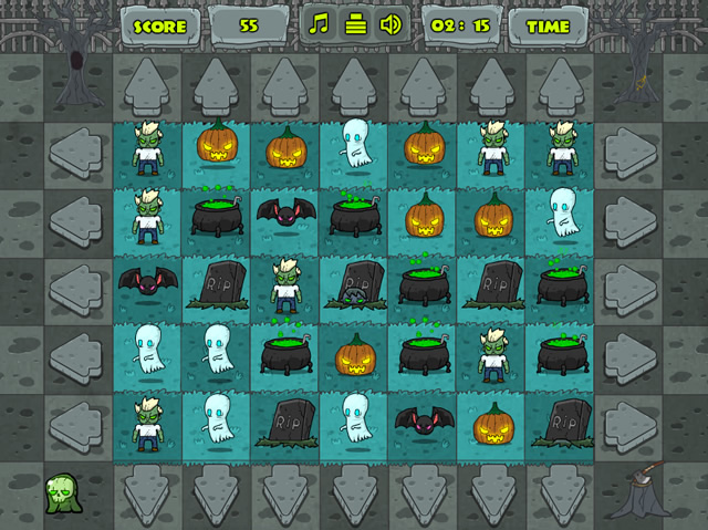 It's Halloween! Zombies, ghosts and vampires can finally come out of their hiding places to walk in the streets of the city. It's fun to see them, and it happens every year. This time, you decided to play a little game with your new friends. Try to combinate them as many times as possible before the time runs out. To move the symbols, click on the arrows located around the grid. You can either move a row or a column. When 3 identical symbols are horizontally or vertically aligned, they disappear and it gives you points. Make the best score ever!