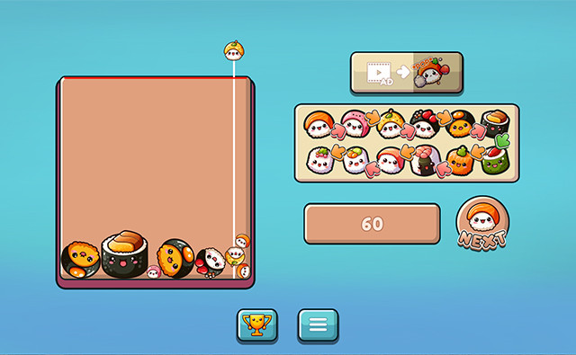 In Popping Sushi, you handle delicious sushi pieces falling into a game board, with the goal of merging them to create increasingly impressive gourmet creations. This puzzle game combines the satisfaction of fusion mechanics with the appetizing aesthetics of Japanese cuisine, offering a gaming experience that is easy to understand but hard to master. When two identical pieces touch, they magically transform into a more elaborate and tastier creation, generating points and bringing you closer to the perfect sushi. Every placement requires foresight and strategy, as the game board fills quickly and merging opportunities become scarce. Take on daily challenges, unlock new types of sushi, and aim to conquer the global leaderboard by reaching the legendary sushi roll that all players desire. Have fun!